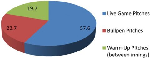 When looking at the number of pitches in a game day I like to reference this study “Unaccounted Workload Factor: Game-Day Pitch Counts in High School Baseball Pitchers—An Observational Study”. In this study they observed 13,769 pitches from Florida based high school athletes and concluded that only nearly half (57%) of the pitches on a game day are what we call pitch counts. The other half of these pitches were from bullpen and warm up pitches between innings. This means using only pitches on a game day, we are making decisions on an athletes readiness to pitch in the future from only half of the pitching specific activity they did that day.